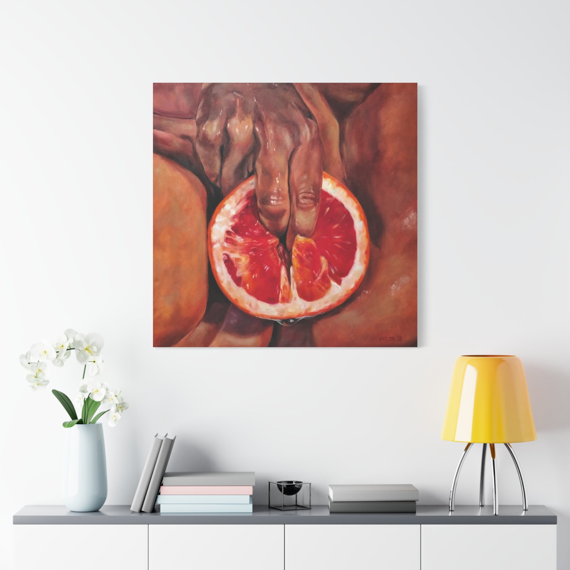 A striking stretched matte canvas that brings a bold, intimate moment into your space. Rich, painterly brushstrokes and warm, fleshy tones draw the eye to a single, sensuous slice of grapefruit—moist, glossy, and rendered with visceral realism. The matte finish softens glare while preserving deep color saturation, giving the piece a gallery-quality presence whether displayed solo or in a curated cluster. Stretched on a narrow 1.25" pine profile, it hangs flush to the wall and reads as a confident, tactile statement—perfect for kitchens, dining nooks, studio walls, or anyone who appreciates contemporary figurative still life with an edge.