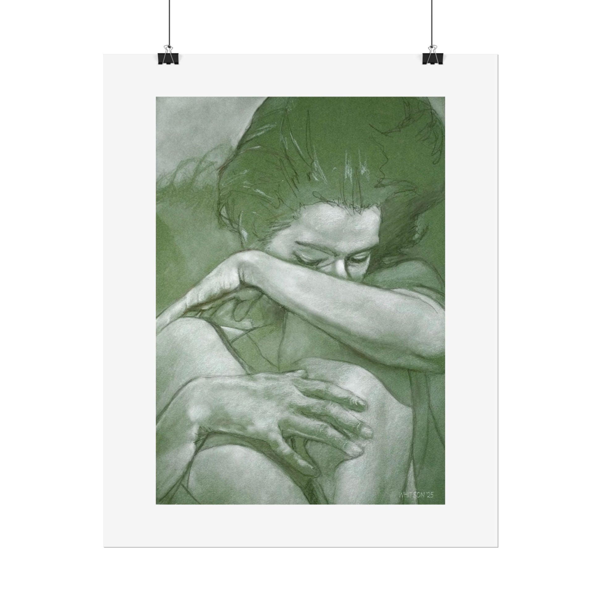 A quietly powerful poster that holds a suspended moment — a tender, intimate figure study rendered in soft greens and graphite-like texture. The image breathes with calm: a person caught mid-embrace, head bowed, arm shielding their face as if listening to a slow heartbeat. Choose from textured fine art, satin semi-gloss, or understated matte finishes to match your space — each option keeps color depth and detail crisp thanks to archival Giclée printing. Hung landscape or portrait, this print brings a contemplative, gallery-quality presence to a bedroom, studio, or reading nook, inviting lingering gazes and gentle conversations.